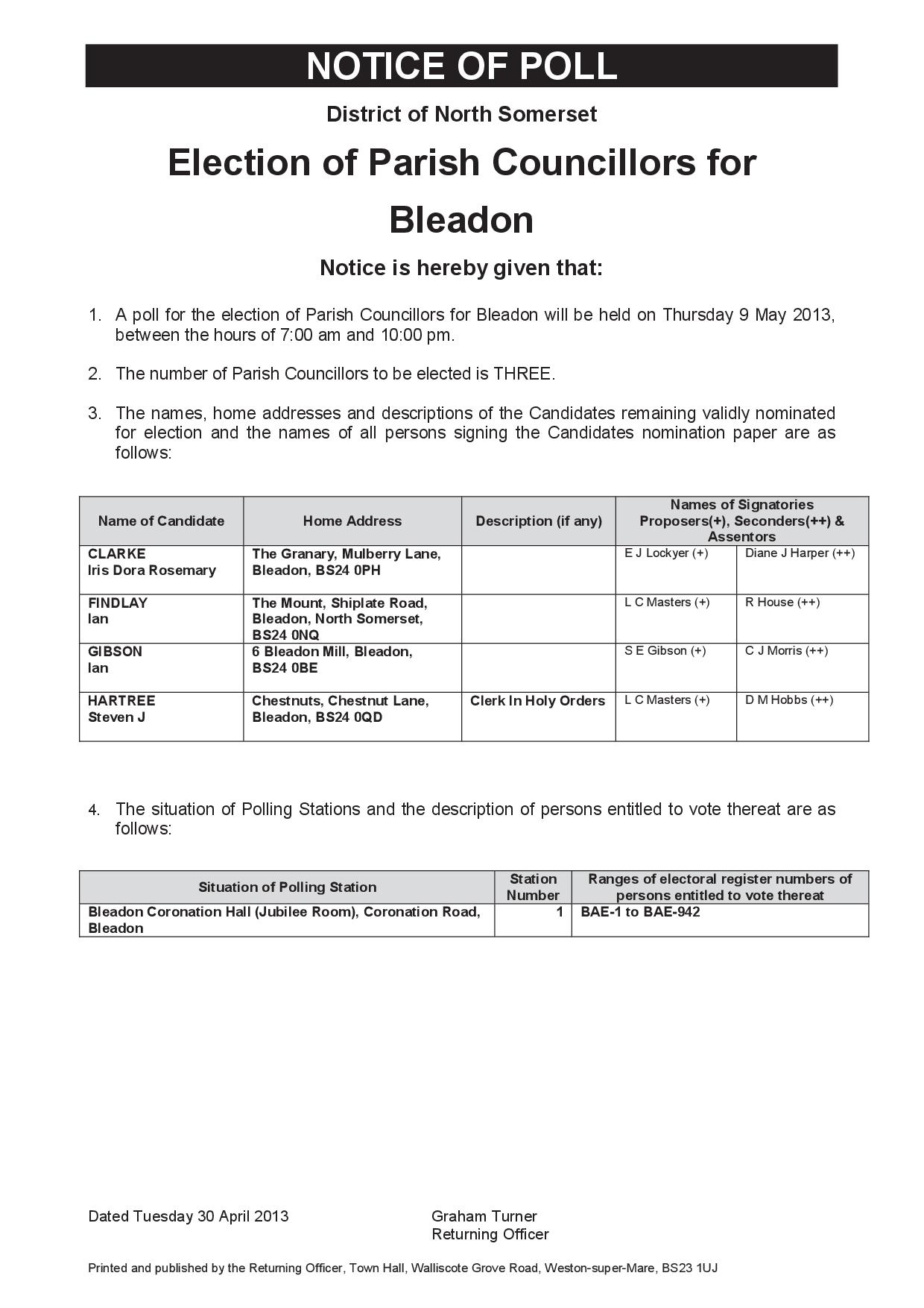 Good luck to all the candidates and regardless of the outcome, the three who are successful can be happy in the knowledge that they were democratically elected by the electorate of Bleadon.