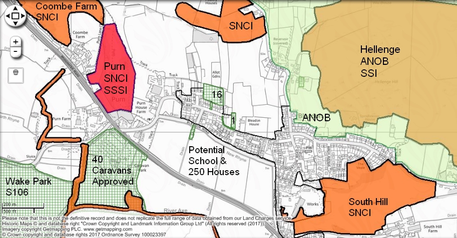 A new application on land adjacent to Rivermead, Purn Way, Bleadon. "Outline application for the erection of a single dwellinghouse and garage, with matters of access and layout to be considered. Matters of appearance, landscaping, and scale reserved for subsequent approval". Another application on a green field site outside the Settlement Boundary.