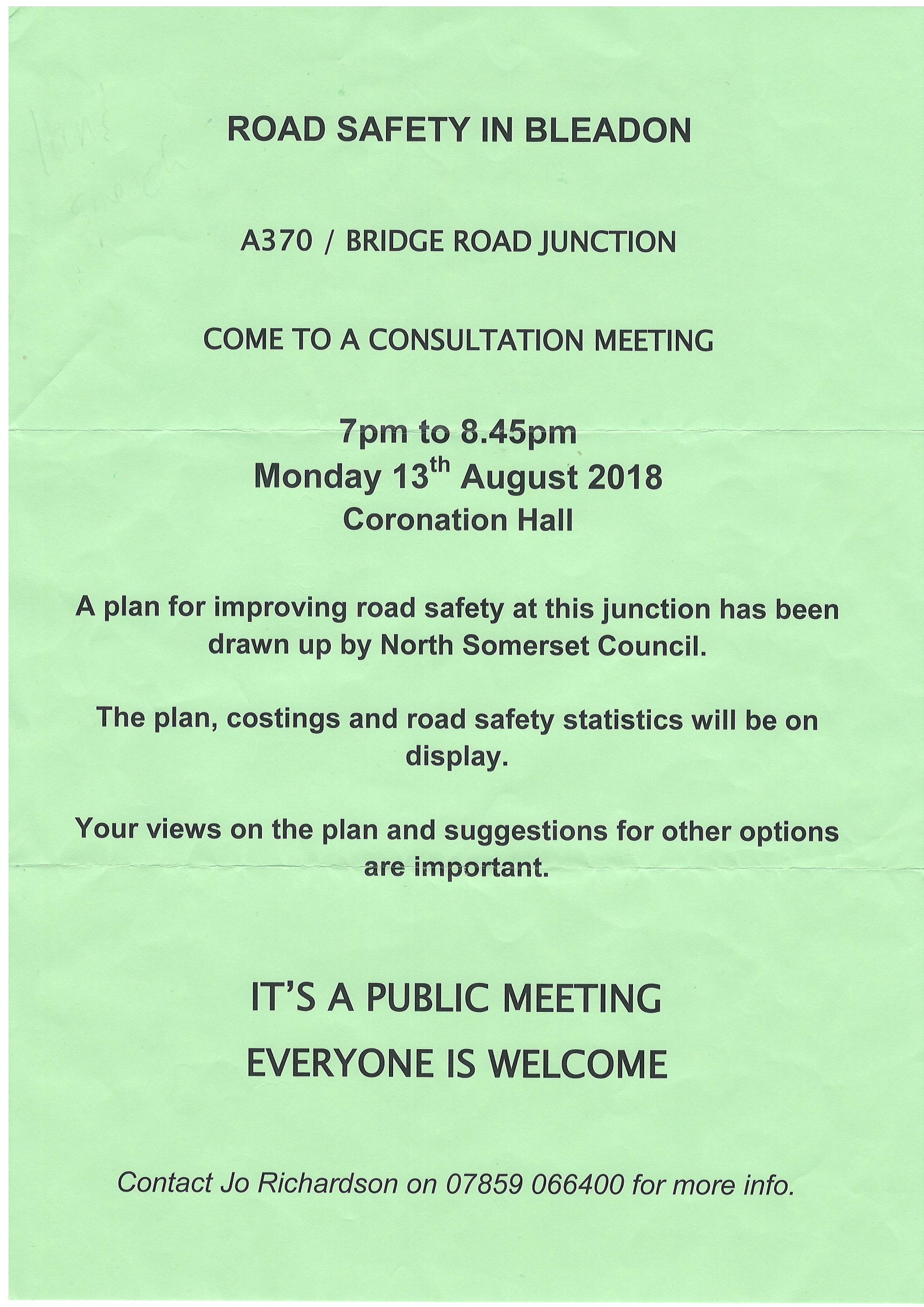 Bleadon Parish Council (BPC) has convened a resident consultation meeting for Monday 13 August 2018 at 7pm to discuss A370 road safety improvements. Some of you may have received a green leaflet inviting you to attend and discuss parishioners’ proposals. NB This green leaflet was not on BPC headed paper, nor was it posted with an agenda on the parish notice boards, nor was information posted on the BPC website or in their parish newsletter