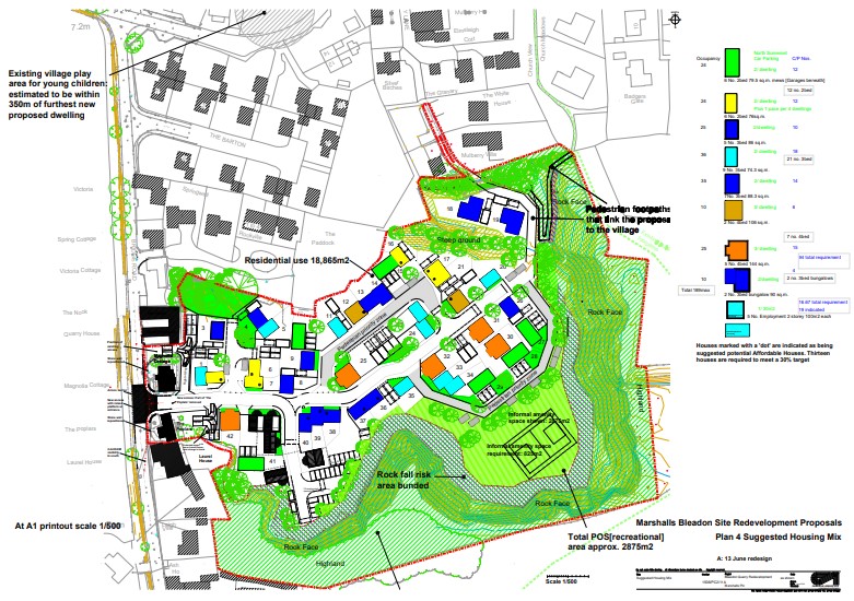 Background: Bleadon is an infill village where Core Strategy Policy CS33 permits small scale residential redevelopment where the proposal is community led with clear community and environmental benefits. Bleadon Quarry is a former limestone quarry located within the settlement boundary, used for the production of concrete products since the late 1980s, but this use is coming to the end of its economic life. It is a brownfield site located within the village, but well enclosed and screened by quarry walls. Bleadon Parish Council supports the mixed use redevelopment of the site where this results in community benefits. The proposed allocation is for 25 dwellings but this figure is subject to further investigation and depends to a large extent on the precise balance of uses eventually proposed on the site, and factors such as the identification of areas of rock fall risk and the extent of shadowing from the quarry walls ...
