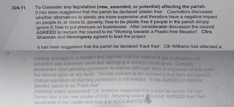 Plastic is a derivative of fracking, which is an imminent issue for Bleadon and the surrounding area. At the meeting BPC also declared "Bleadon parish to be Frack-free" and "AGREED that the Clerk write to the Leader [of NSC] and copy it to ALCA and DEFRA"