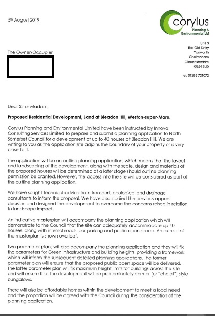 Corylus Planning and Environmental Limited have been instructed by Innova Consulting Services Limited to prepare and submit a planning application to North Somerset Council for a development of up to 40 houses at Bleadon Hill. We are writing to you as the application site adjoins the boundary of your property or is very close to it.