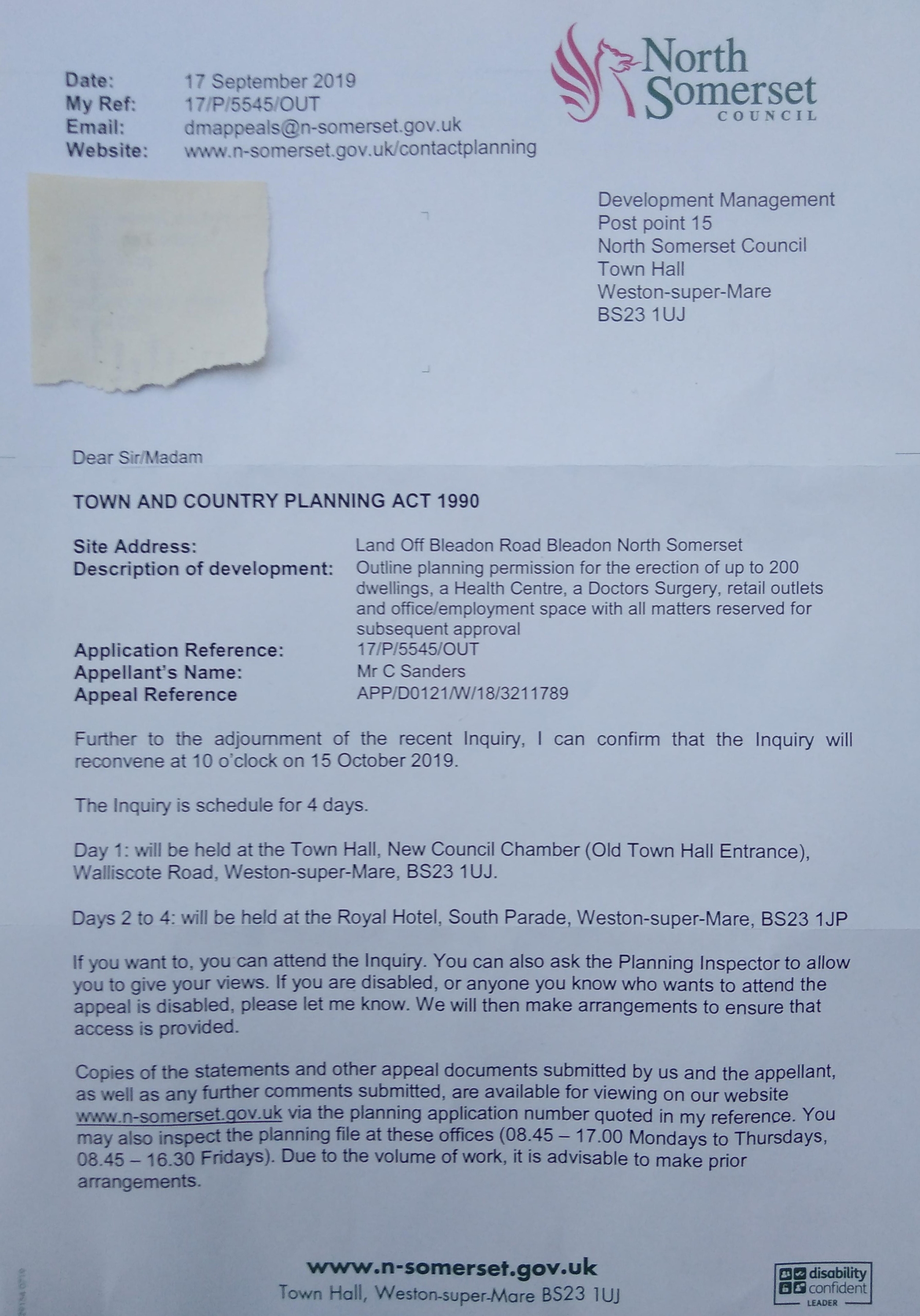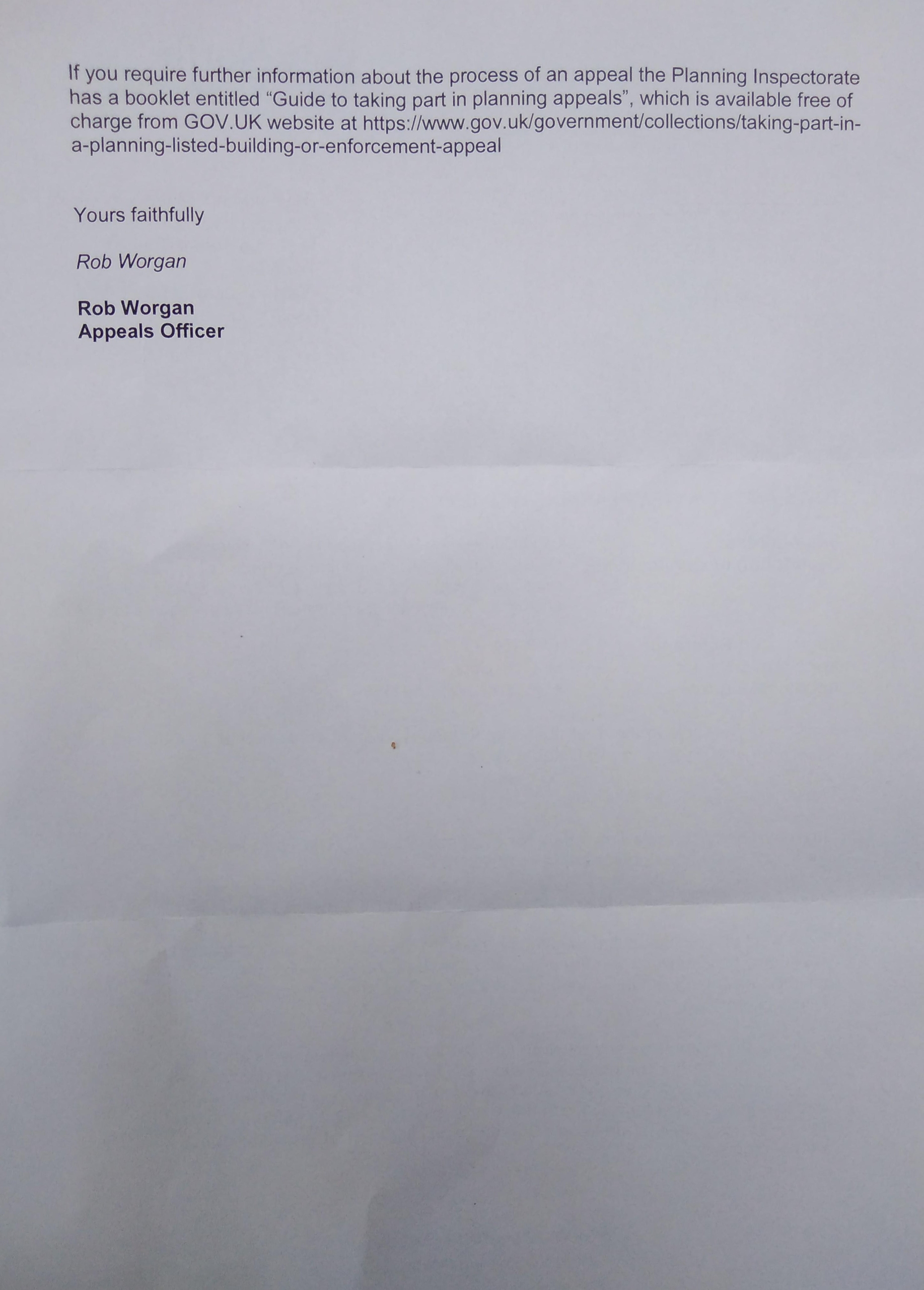 UPDATE: 17 Sept 19 Some residents receive letters, "If you want to you can attend the Inquiry. You can also ask the Planning Inspector to allow you to give your views..."