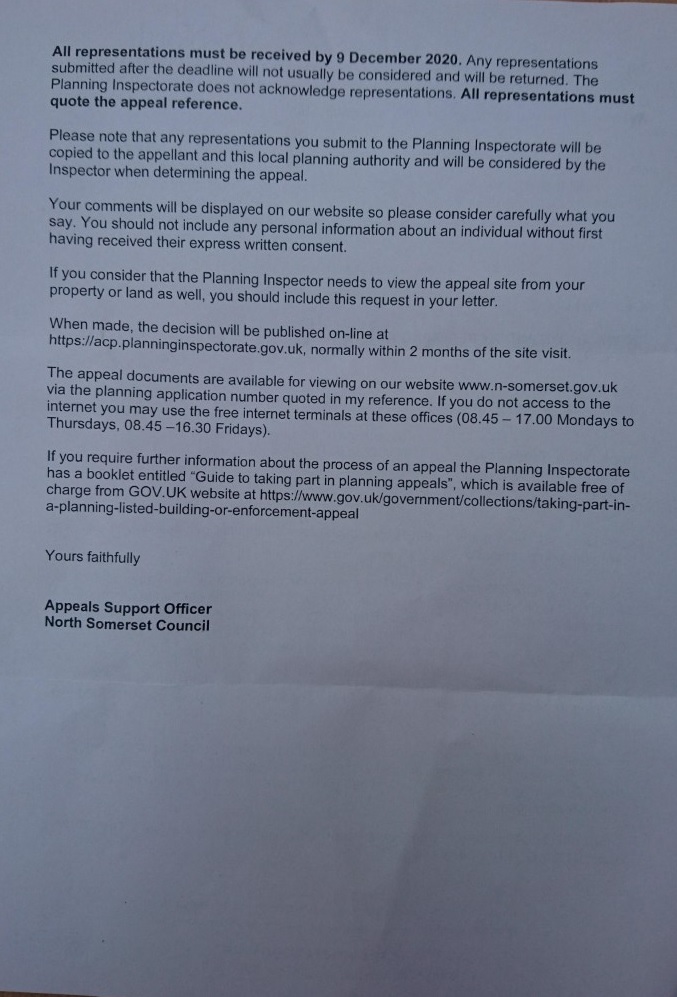 "You must notify any person who was notified or consulted about the application in accordance with the Act ... If they want to make any additional comments they must submit 3 copies within 5 weeks of the starting date, by 09 December 2020. If comments are submitted after the deadline, the Inspector will not normally look at them and they will be returned" (PDF)