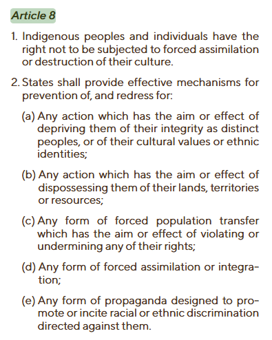 - Forced assimilation is illegal under UN Declaration of the Rights of Indigenous Peoples (PDF) and UN Manual (PDF) Full version 02OCT07 (PDF)