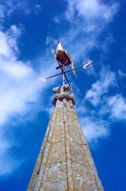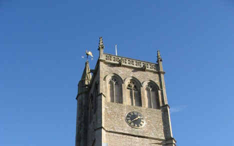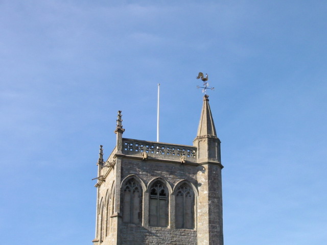 The Tower The tower at the West end of the church was added in the early 15th century. A glimpse of a pleasant stone ceiling can be seen through the vestry screen. The tower is officially dexcribed as "Perpendicular of the triple windowed class". It is some 80ft in height and roofed in lead, which was renewed in 1962, replacing lead dated 1766. The tower has several interesting gargoyles, in particular the little man in tight hose, sitting cross-legged and playing a form of bagpipes. He can be seen on the left above the clock dial on the west face. The tower contains three chambers - the ringing chamber, the clock chamber and , highest of all, the belfry.