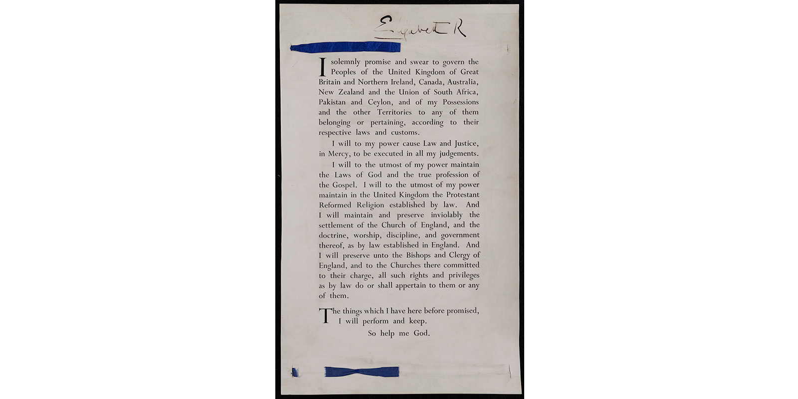 Transcription: Elizabeth R "I solemnly promise and swear to govern the Peoples of the United Kingdom of Great Britain and Northern Ireland, Canada, Australia, New Zealand and the Union of South Africa, Pakistan and Ceylon, and of my Possessions and the other Territories to any of them belonging or pertaining, according to their respective laws and customs. I will to my power cause Law and Justice, in Mercy, to be executed in all my judgements. I will to the utmost of my power maintain the Laws of God and the true profession of the Gospel. I will to the utmost of my power maintain in the United Kingdom the Protestant Reformed Religion established by law. And I will maintain and preserve inviolably the settlement of the Church of England, and the doctrine, worship, discipline, and government thereof, as by law established in England. And I will preserve unto the Bishops and Clergy of England, and to the Churches there committed to their charge, all such rights and privileges as by law do or shall appertain to them or any of them. The things which I have here before promised, I will perform and keep. So help me God."
