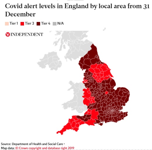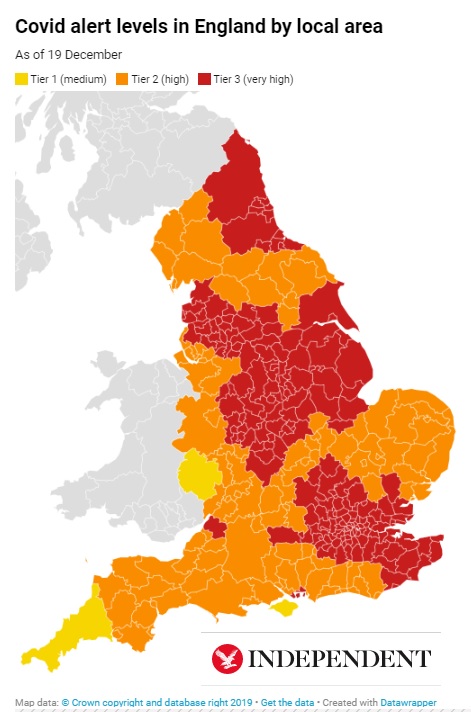 Covid alert levels in England by local area Independent Newspaper Government Tiers by Postcode |