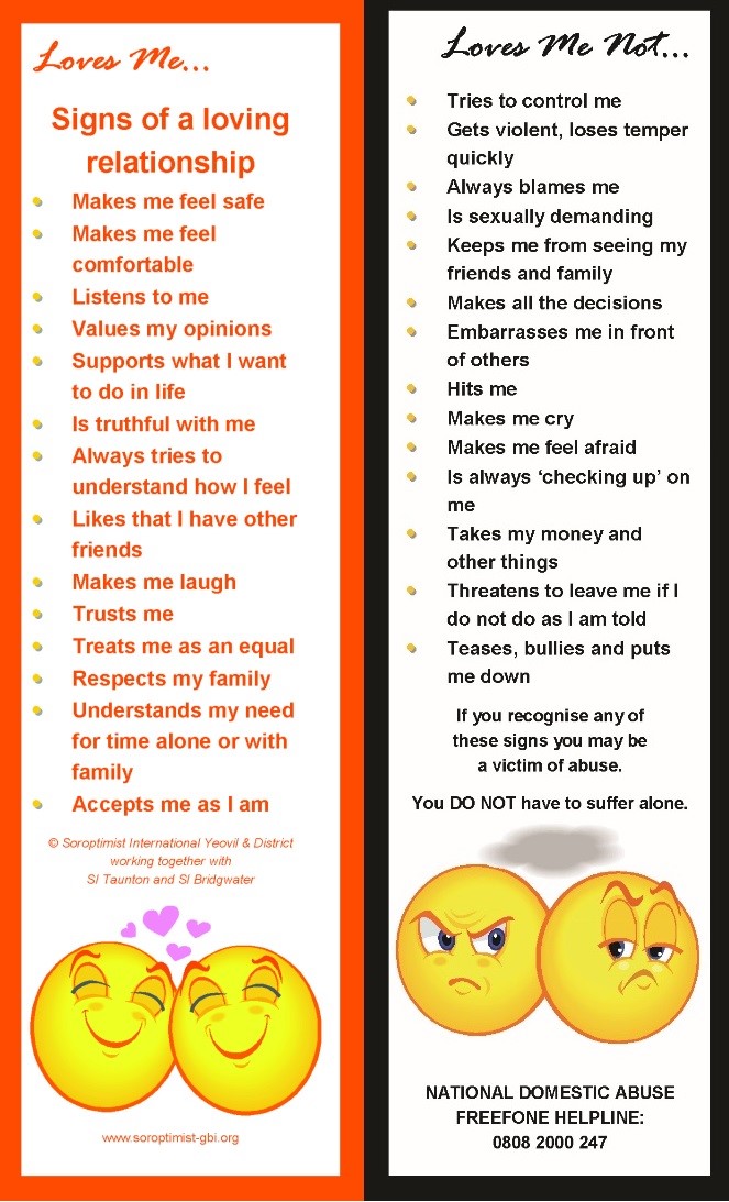On this day, for the past three years, supported by Tara Newley Arkle and Soroptimists of the South West Region, the women of SI Weston have drawn attention to domestic abuse. They wear an item of orange and hand out Loves me, Loves me not bookmarks. These bookmarks include a checklist to help people understand that they do not have to tolerate persistent abuse or controlling behaviour in a relationship. They are already in use by many North Somerset schools.