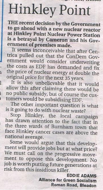 | Hinkley Point and Connection project | Link to National Grid Save our Valley Campaign Weston Mercury - Letter to Editor and Alliance for Green Socialism Stop Hinkley website |