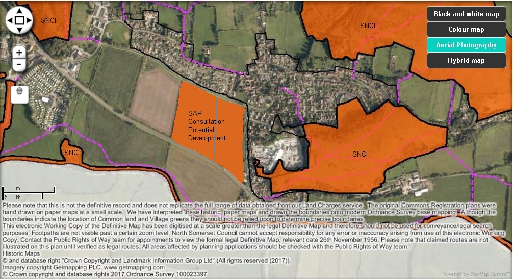The following maps were created, and subsequently annotated, using the NSC GIS system which is a useful resource to see what policies and emerging proposals affect our land and environment in North Somerset. Also see the associated Major Development Table containing site specific information and questions to Bleadon Parish Council and North Somerset.