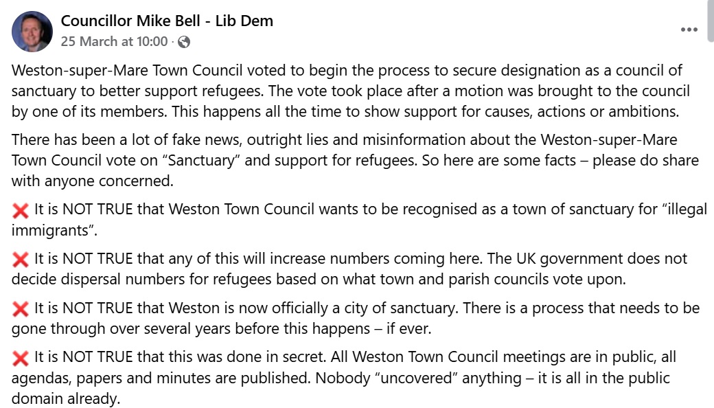"Weston Town Council supports City of Sanctuary U.K. in its vision that the U.K. be a welcoming place of safety for all and is proud to offer sanctuary to people fleeing violence and "persecution.