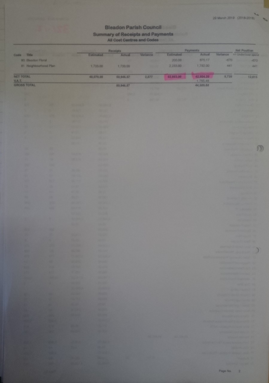 | Bleadon in Bloom | £3,290 | ? | £2,420 (Min 317.17 & Reserves) | £870.17 (Audit 2) | "The total project value to date was £8,292.40 being cash £1,602.15 and gift in kind £6,690.25. The Blue Hearts trail leaflet cost £150 to print. Advertising of £175 covers this cost" (Min 324.19)? Apr 2019 Report - last page. Trophy display in halls (Min 327.9.iii) | ||||