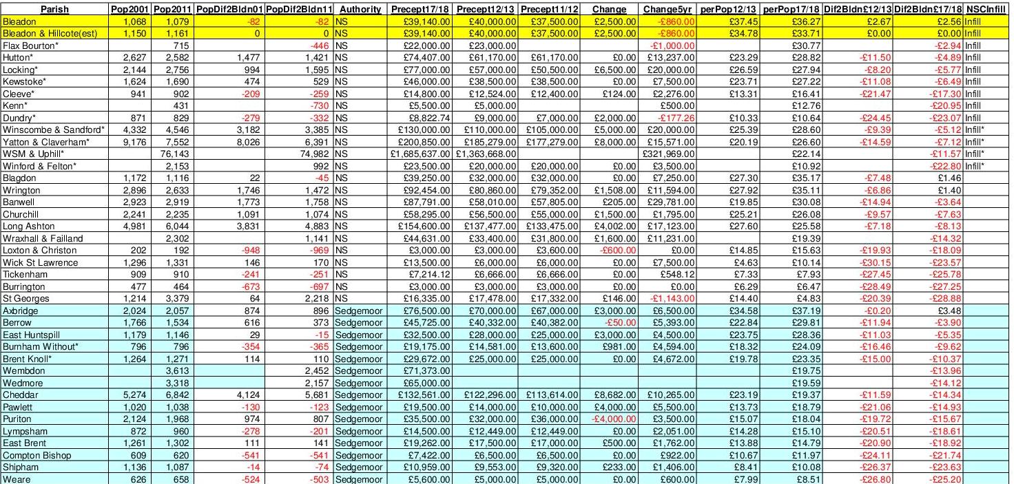 2012/13 , 2013/14,2014/15summary&2014/15detail, 2015/16, 2016/17, 2017/18, 2018/19, 2019/20, 2020/21, 2021/22, 2022/23, 2023/24 2024/25 (Bleadon Precept second highest in NSC)