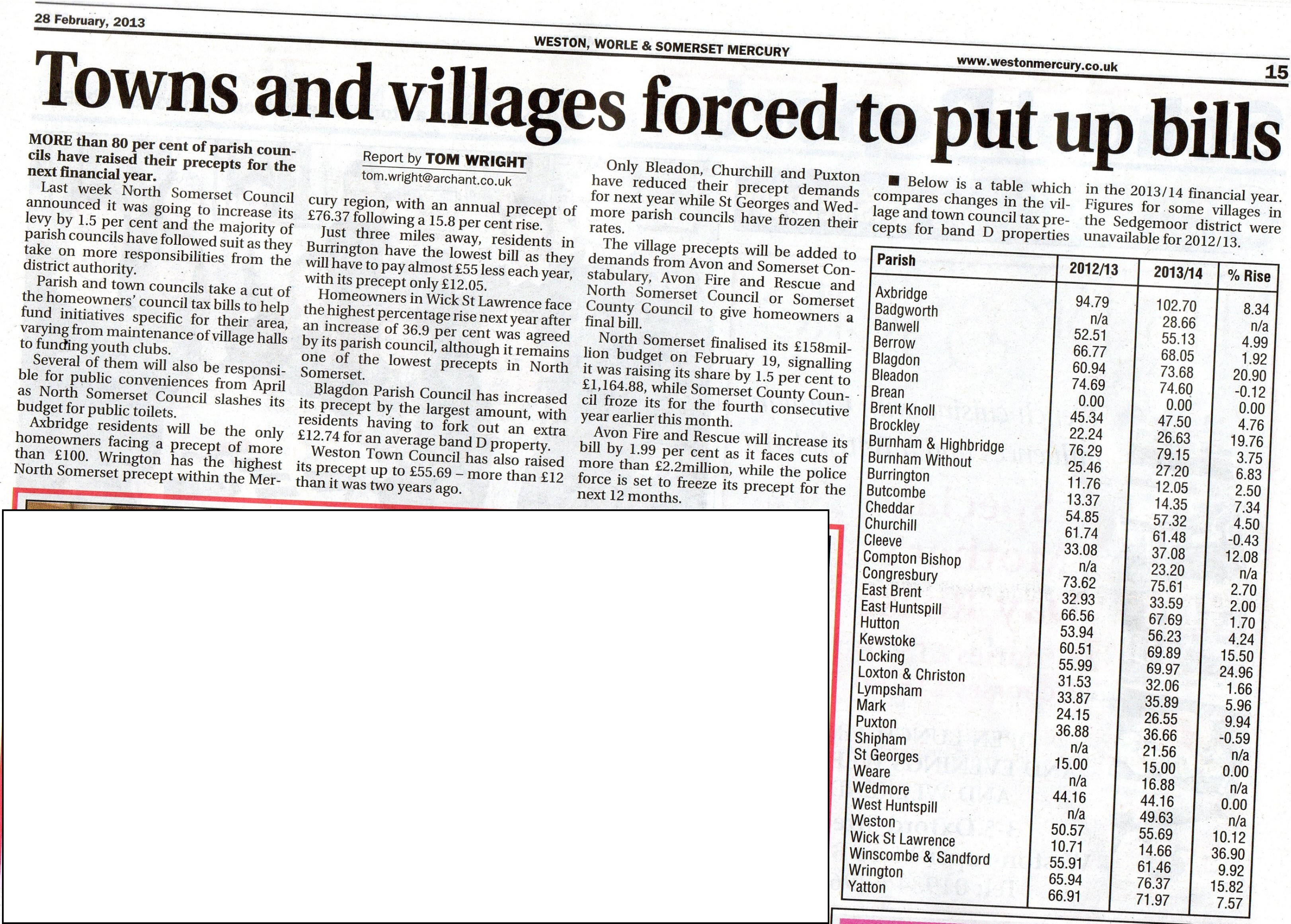 | 2013/14 | £38,000 | -5.00% | 2.6 | NB: Budget £39,225. North Somerset also gave an additional grant. PC decide to take on toilets from North Somerset. BOB raises awareness of PC issues through BeInvolved Blog. Major Outline Housing development application for Bleadon Quarry. See also Mercury report on Band D comparison |