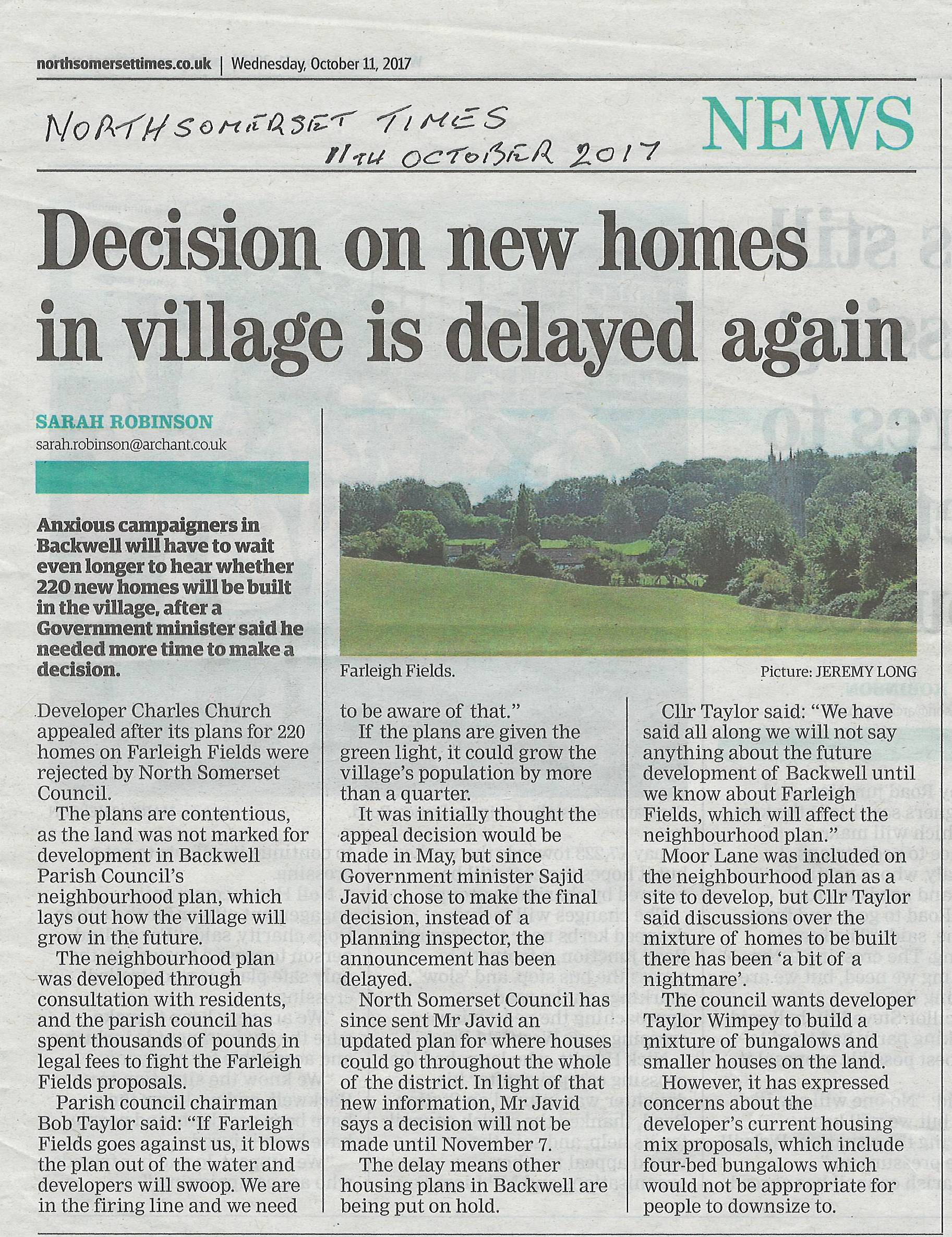 11 Oct 17 article in North Somerset Times "The plans are contentious, as the land was not marked for development in Backwell Parish Council's neighbourhood plan, which lays out how the village will grow in the future. The neighbourhood plan was developed through consultation with residents, and the parish council has spent thousands of pounds in legal fees to fight the Farleigh Fields proposals."