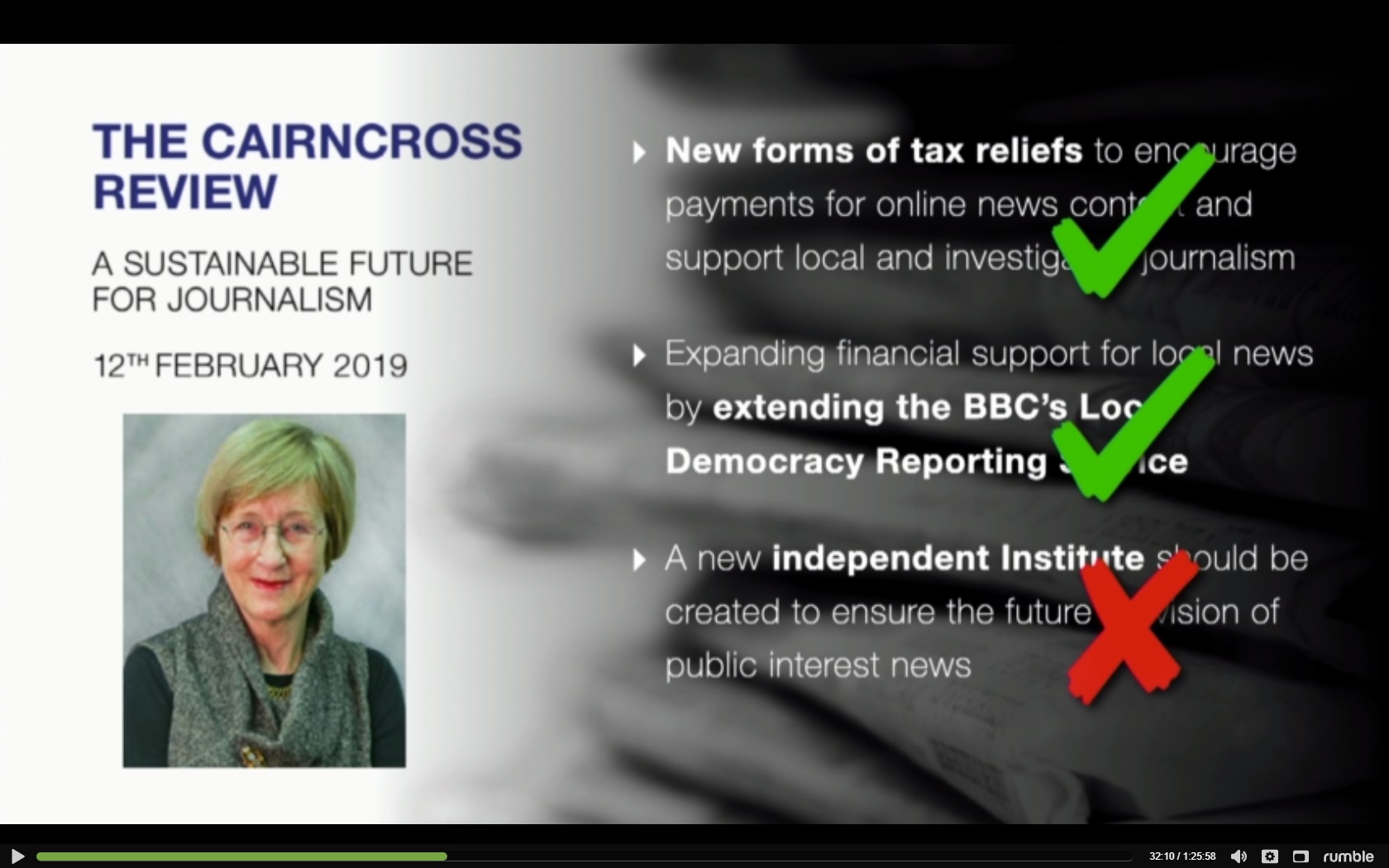 - page 88 - Conclusion -"Government has several roles in supporting the future of journalism. ...But in the case of public-interest journalism, there are wider responsibilities... Of all the areas where intervention to support high-quality journalism is justified, local democracy reporting is the most urgent and important. The loss of coverage by professional reporters of the machinery of local and regional government is a serious issue for a democracy... No area of journalism is so important for the health of local democracy."