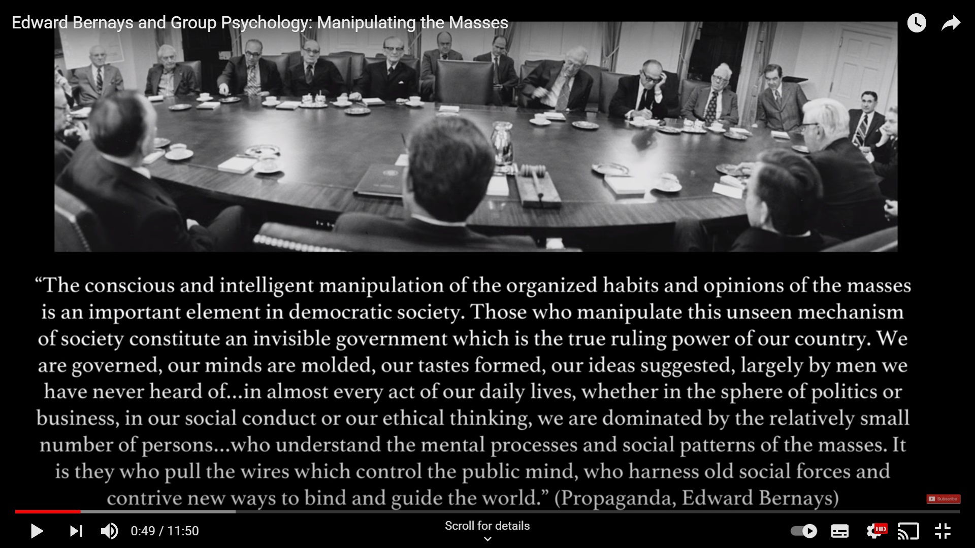 "We are governed, our minds are molded, our tastes are formed, our ideas suggested, largely by men we have never heard of ... in almost every act of our daily lives..." Propaganda - Edward Bernays