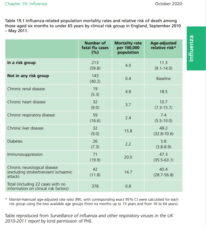 Compare tables for COVID19 (chapter 14a) and Flu (chapter 19) for different ages and at risk groups.