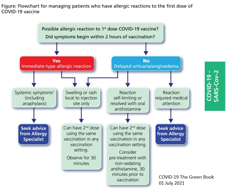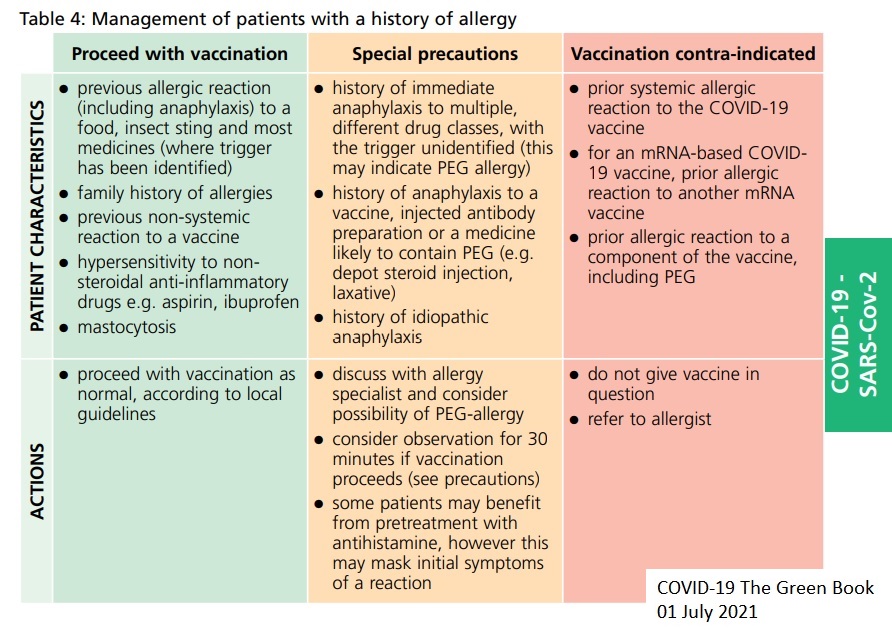 - Anaphylaxis following COVID-19 vaccination ... the MHRA is no longer advising that individuals with a history of anaphylaxis to any vaccine, medicine or food do not get the vaccine. Anyone with a previous history of allergic reactions to the ingredients of the vaccine should not receive it, but those with any other allergies (such as a food or penicillin allergy) can have the vaccine."