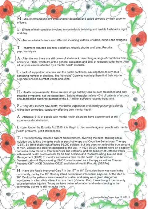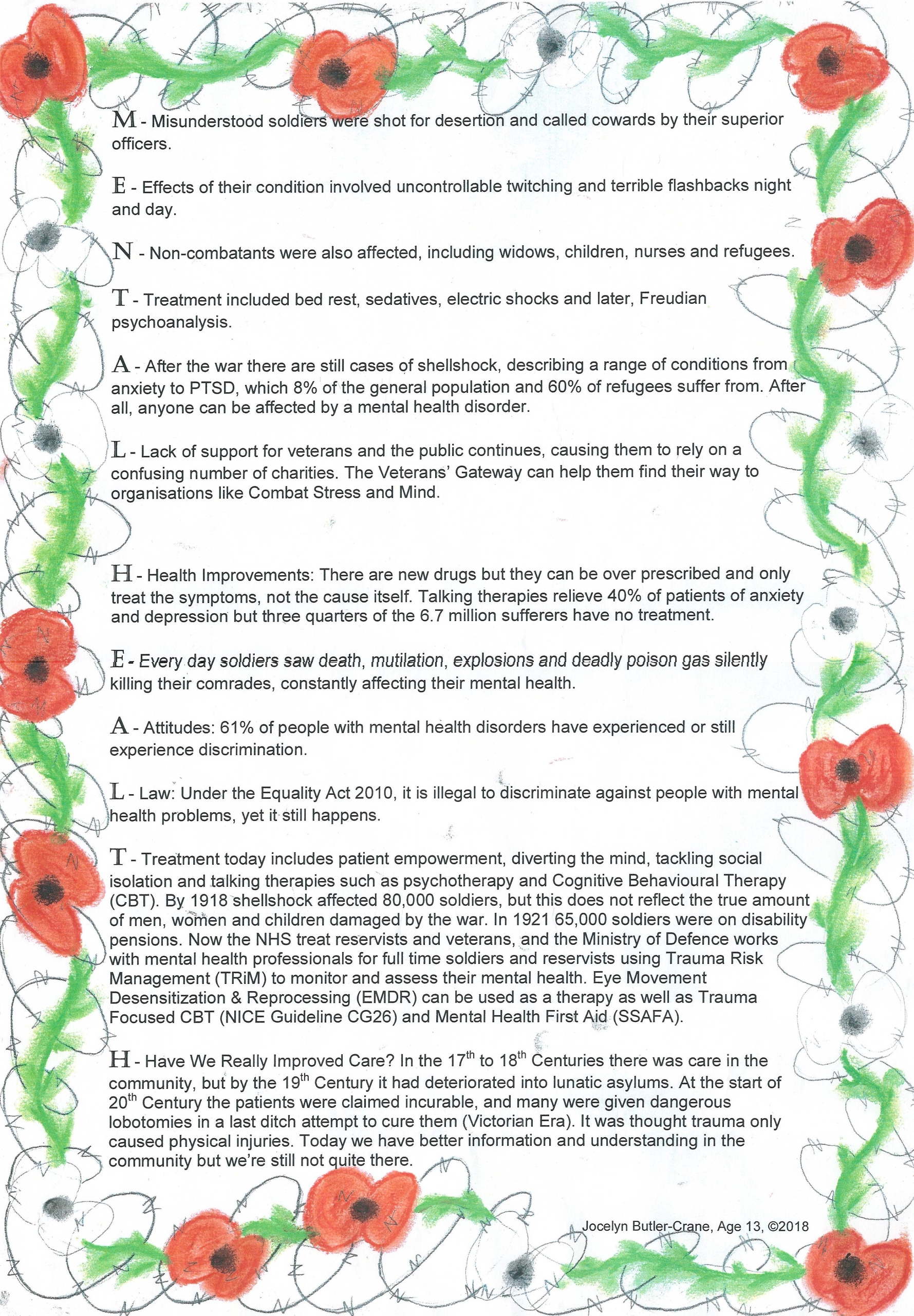Thoughts from a resident of Bleadon, "Thank you for taking the time and care to produce your 'Remembrance' folder. I not only thank you only behalf but I know I can offer a sincere thanks on behalf of my dearly loved grand parents, parents and uncle as they would have been so touched that a young person was remembering the pain and distress they endured through two world wars and in fact ever after. My grandfather served in Belgium and his brother Frank aged 19 years was killed at Gallipoli. My grandmother brother William (Harry) was killed at the Somme. WW1. and Frank their son and my Mothers' and Uncles' brother aged 20 was killed at Monte Cassino WW2. I have collected words that mean a lot to me and I have sent attachment of these."
